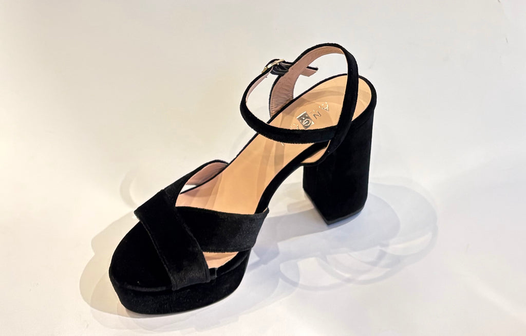 Sandalia de vestir de terciopelo con plataforma .Tavon de 11 sm y plataforma de 4 sm ,con doble plantilla de gel lo que la convierte en muy cómoda .