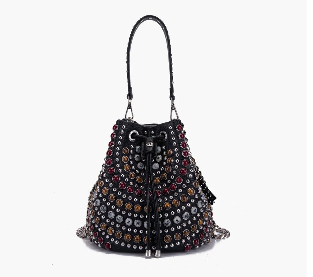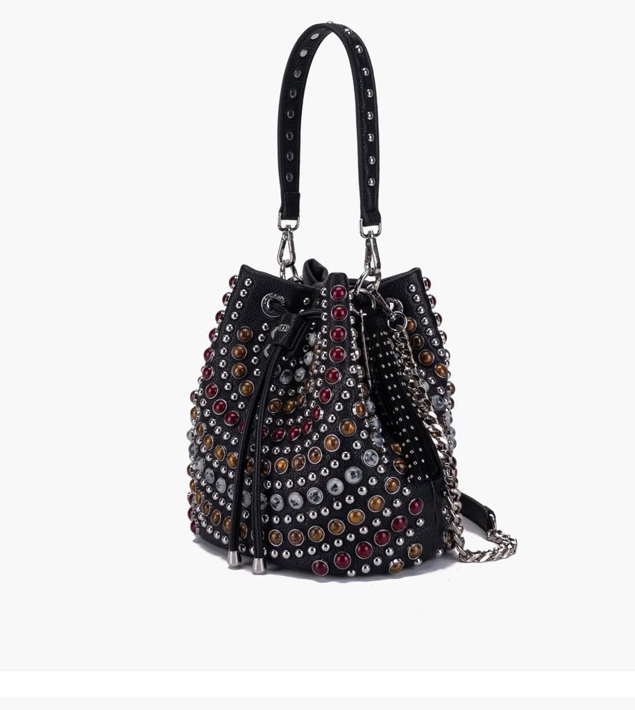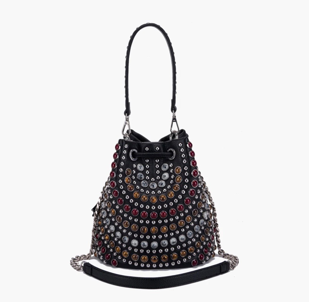 Bolso de mujer de la firma italiana La Carrie.Bolso tamaño mediano lleno de cristales y tachuelas .Un magnífico capricho